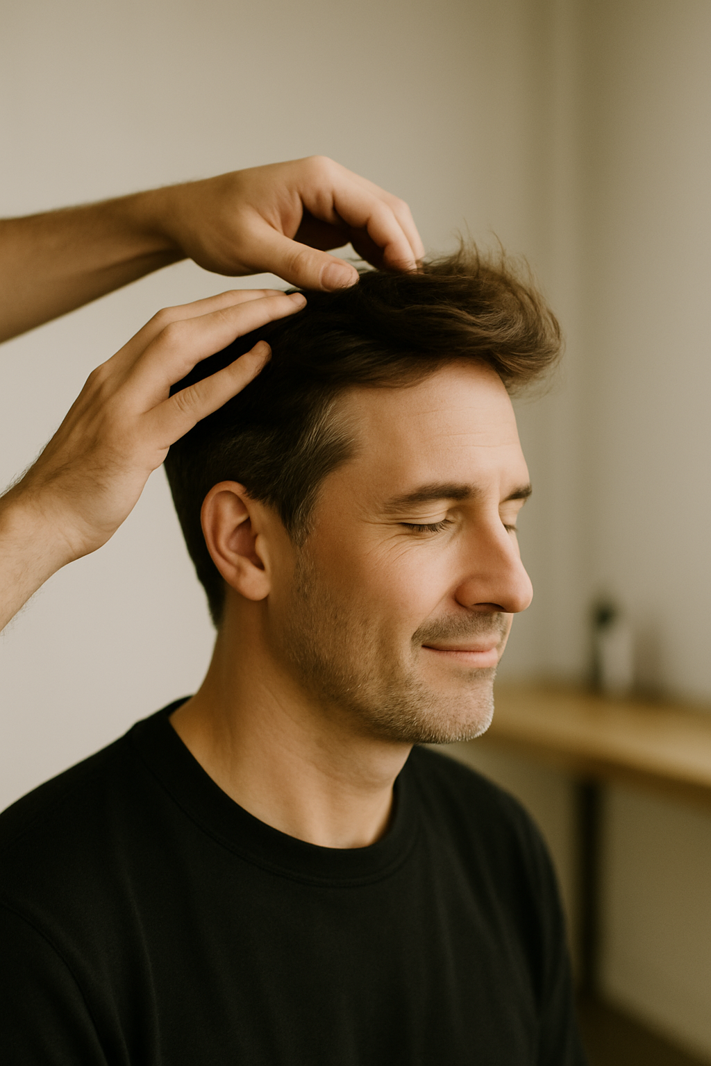 Depending on your needs and the system type, we secure them using medical-grade adhesive, bonding agents, clips, or hair weaving techniques. The fit is personalised, ensuring that your hair system stays firmly in place - even during active movement or warm weather.